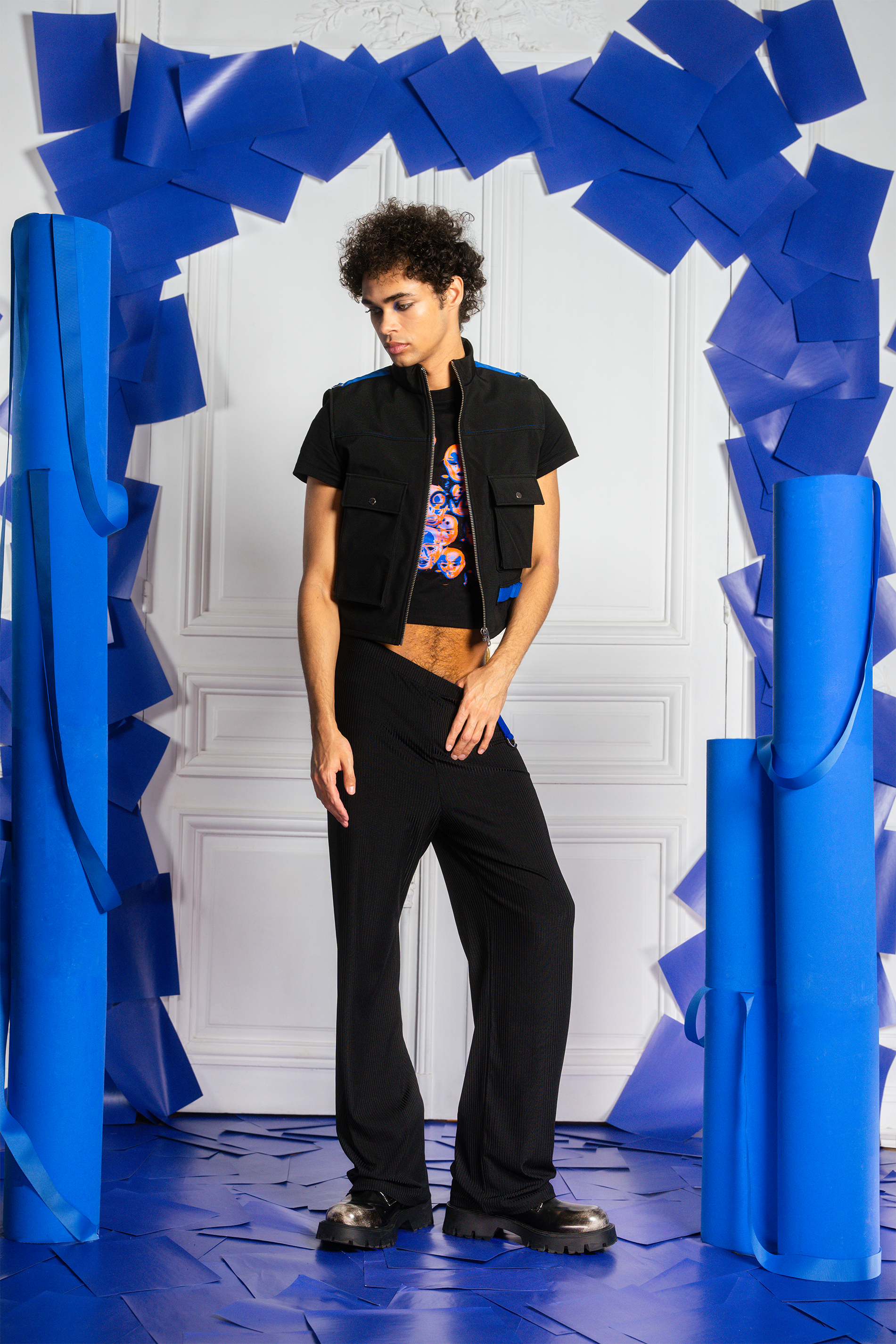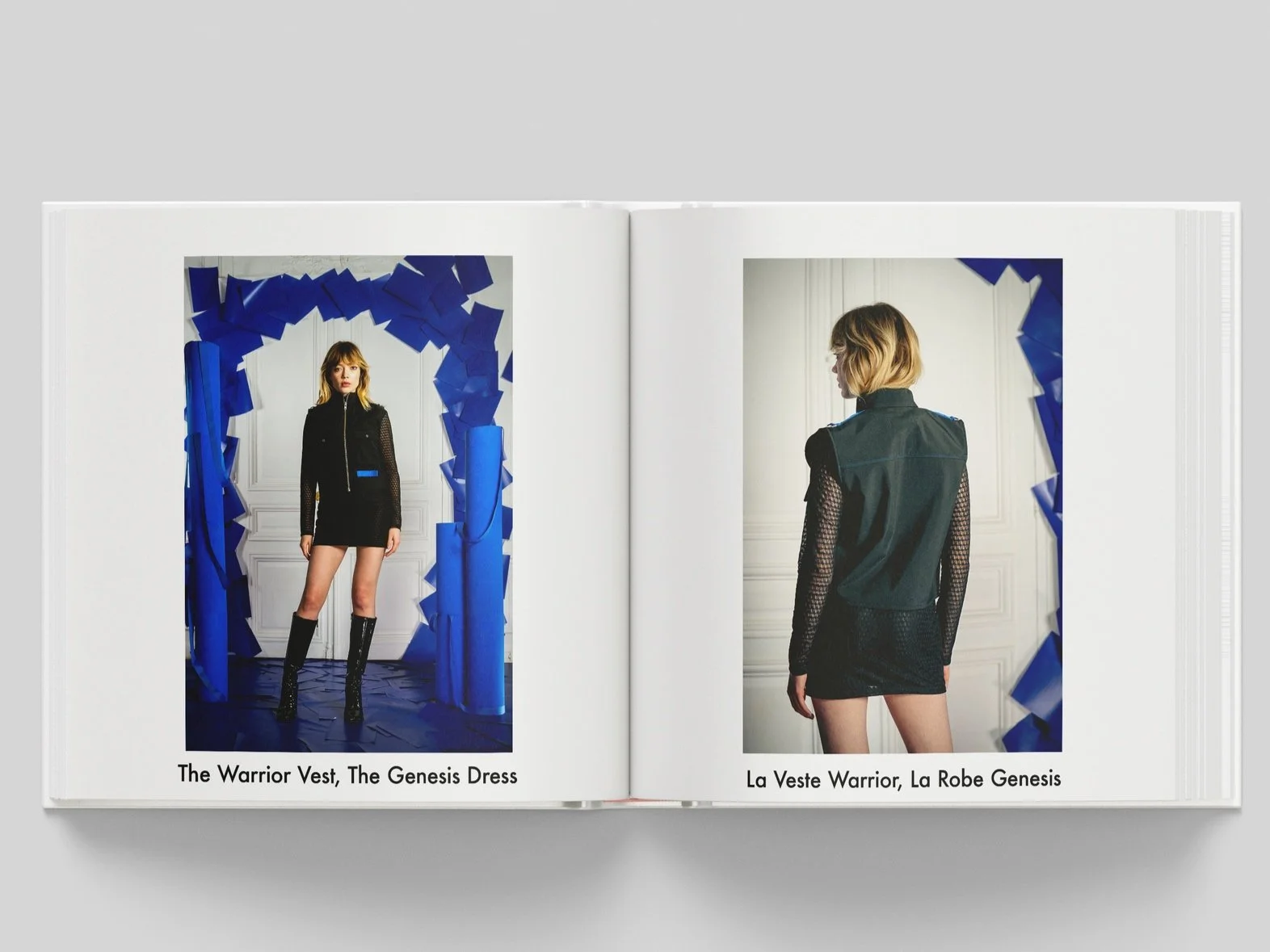 I oversaw both production and set design, as well as decisions regarding camera angles and framing. I had to ensure the images were versatile—suitable for cropping to a clean white background for product shots, while also working for social media and branding purposes when left uncropped. To tie the lookbook to the narrative of the "MINUIT" campaign film, I conceptualized a portal in a Klein blue color, a defining element of the collection. I sourced blue cardboard pillars, which I arranged and later edited to appear smoother, drawing inspiration from the idea of a surreal, dead forest.